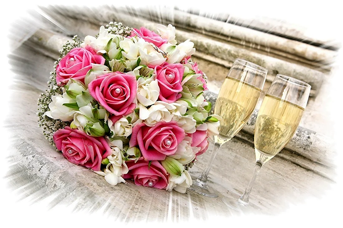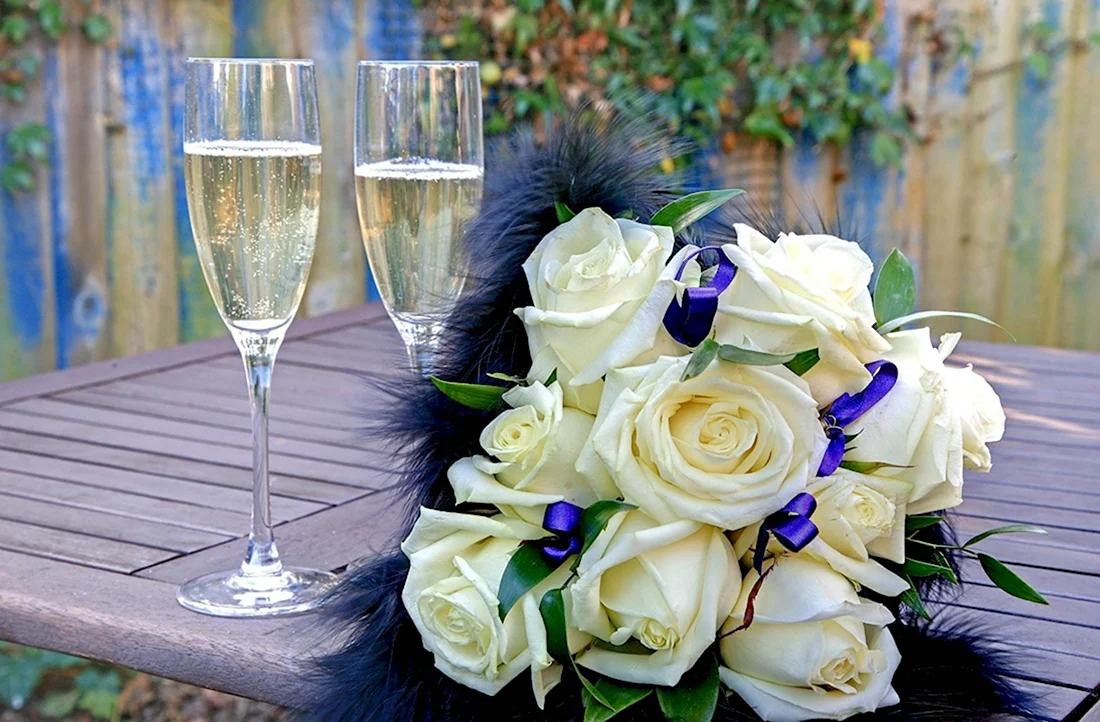 Свадебный букет и шампанское.