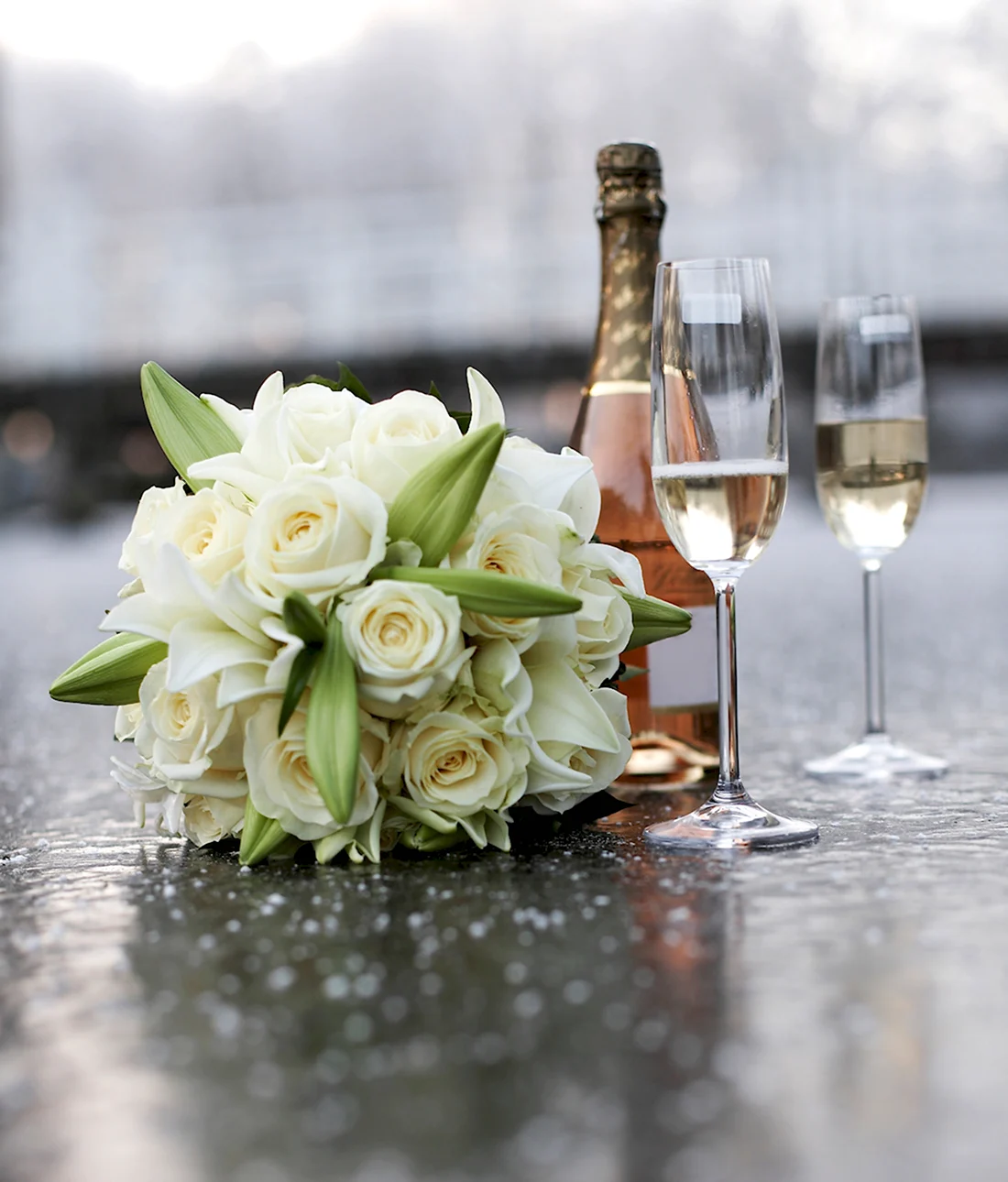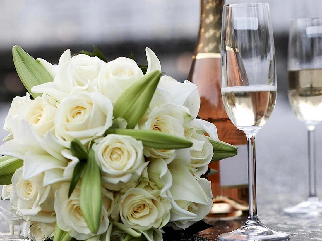 Букет цветов и шампанское.