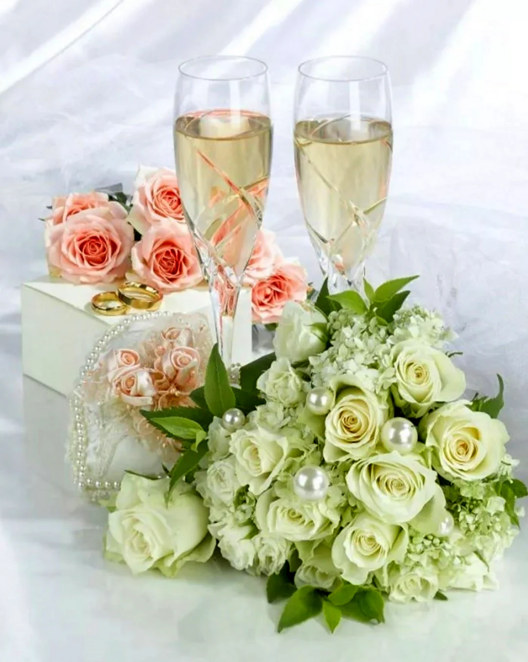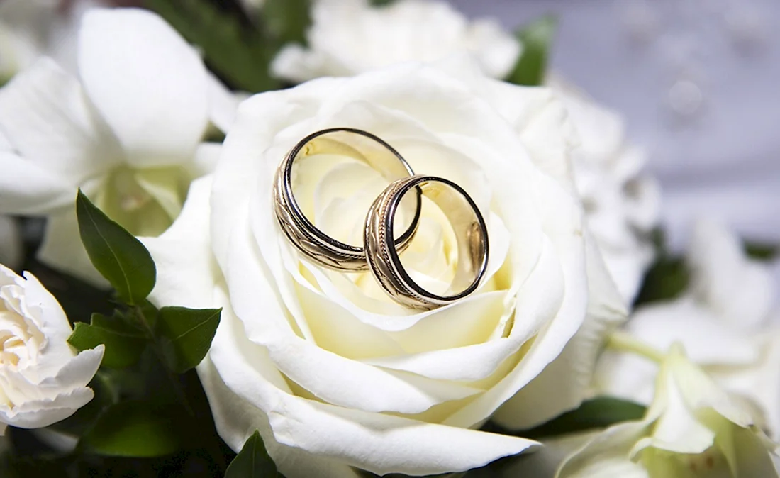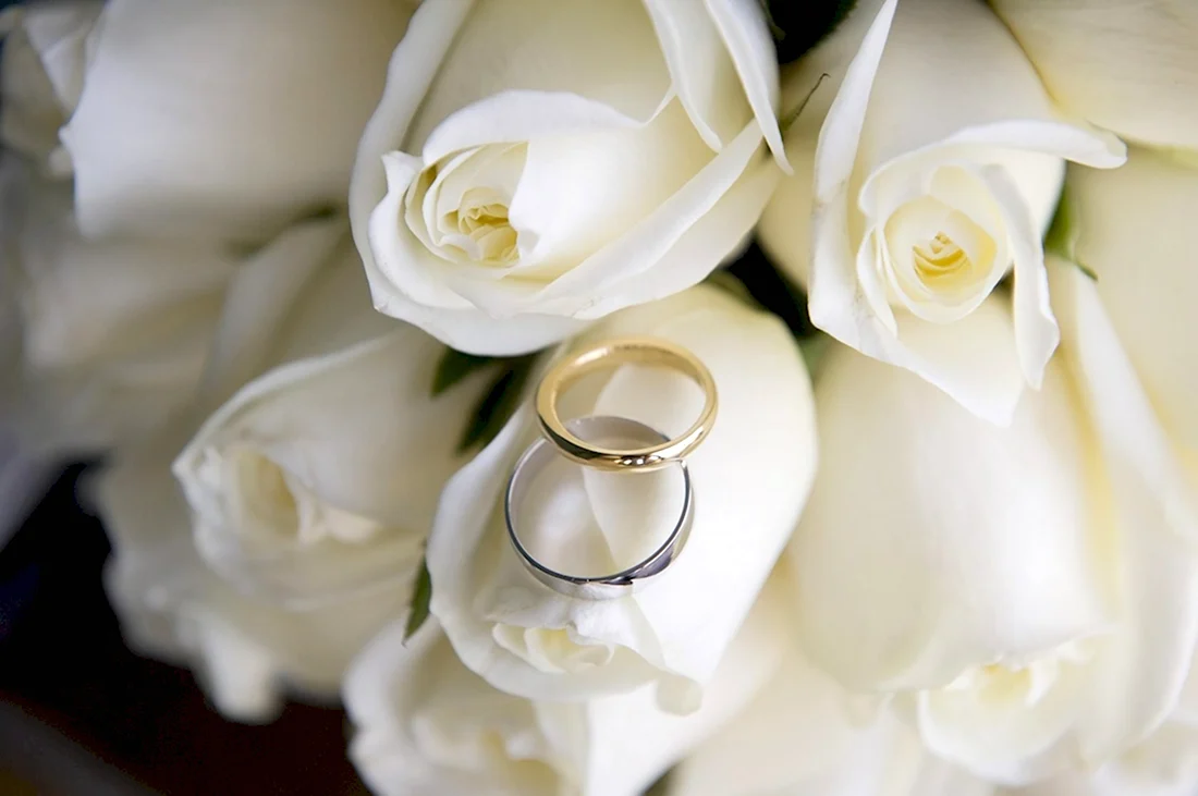 Белые розы с обручальными кольцами.